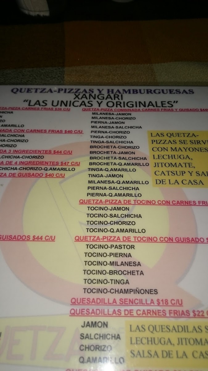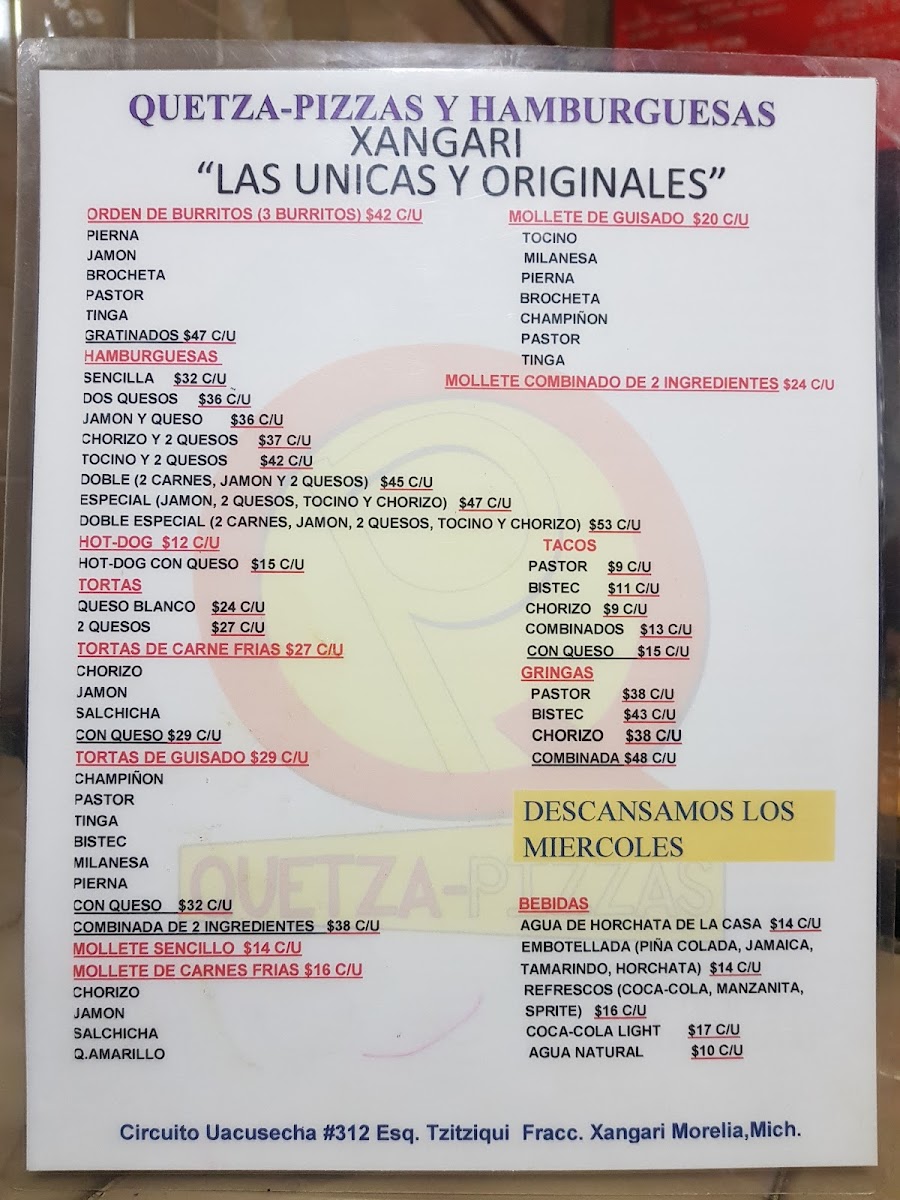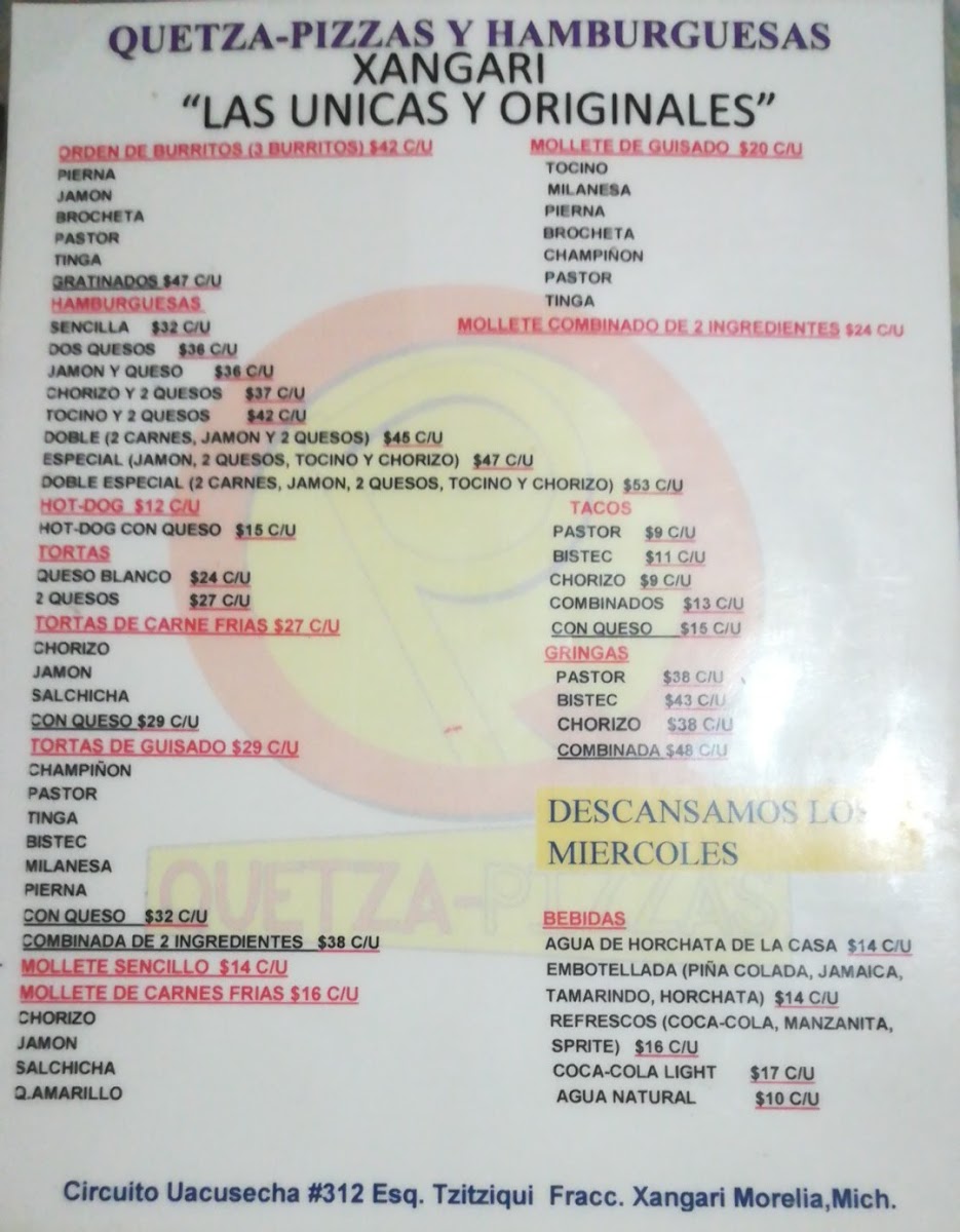 Welcome to Quetzapizzas Xangari, where the vibrant flavors of Michoacán shine through a delectable menu. Located at Cto. Uacusecha 360 in Morelia, this restaurant has garnered an enthusiastic following thanks to its rich assortment of quetzas, tacos, hamburgers, and more.